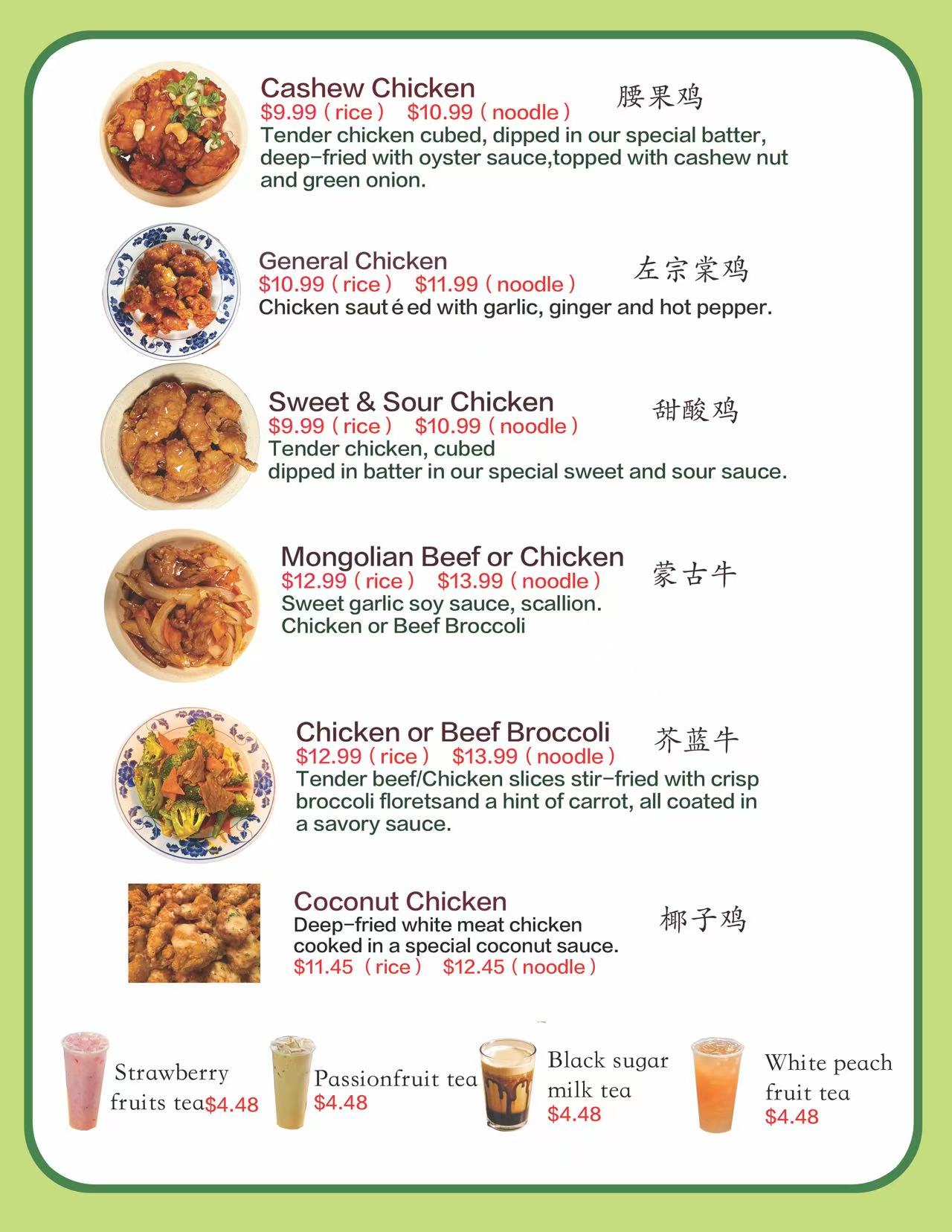 To meet the dining needs of more customers, we have added a menu of popular American-style Chinese dishes to our existing traditional Chinese menu. We hope you will all come and try them. Additionally, we will be open as usual during the Christmas season. We welcome you to come and enjoy our food.